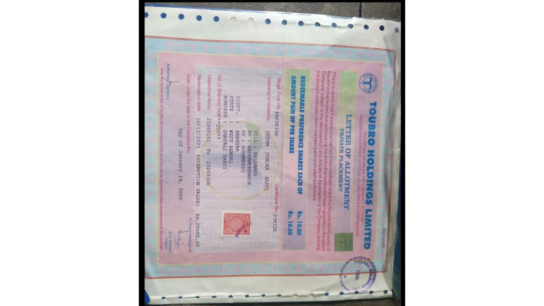 Bidyut Barui My father invested Rs. 2000- against 200shares of TOUBRO HOLDINGS LIMITED (Regd. office S.C.O. 52-53, Sector 9-D, Chandigarh) in the year 2006 and the due date for redemption payment was 10.12.2021, but the payment had not been cleared. The details of the investment given below: Name of the Holder: SHYAM SUNDAR BARUI Addre...
