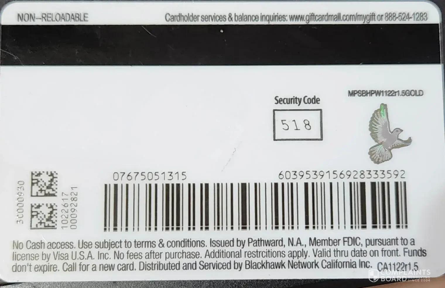 I received a visa $100.00 gift card from blackhawk network and the card had already been used. I have seen on the complaints page that this has happeded to dozens of people recently. Their 800 phone number does nothing and you can not talk to a live representative which is very suspicious. I filed complaint and have not had any resolution. It is obviou...