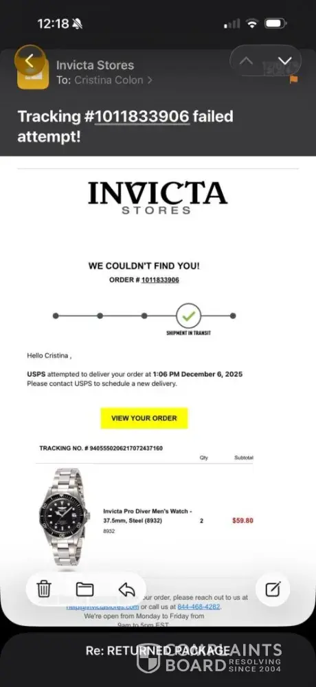 I placed an order for two watches in November, they arrived in the mail on different dates, one on December 4 and the other on December 6. The email is sent back to invicta because it does not have enough address. I have tried to contact you and sent emails and calls and have not received a response. I need to know solution for this problem. Email me [protected]@icloud.com
