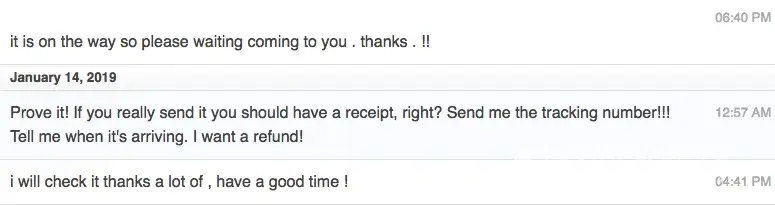 The seller has been good at communicating with me, but he never gives me any solid information. I've asked for a valid tracking number several times, but he always gives me the same one, which doesn't work. I tried to get my money back, but no one will help me. PayPal only gives you 45 days to dispute an order and get a refund, so I missed that deadline.