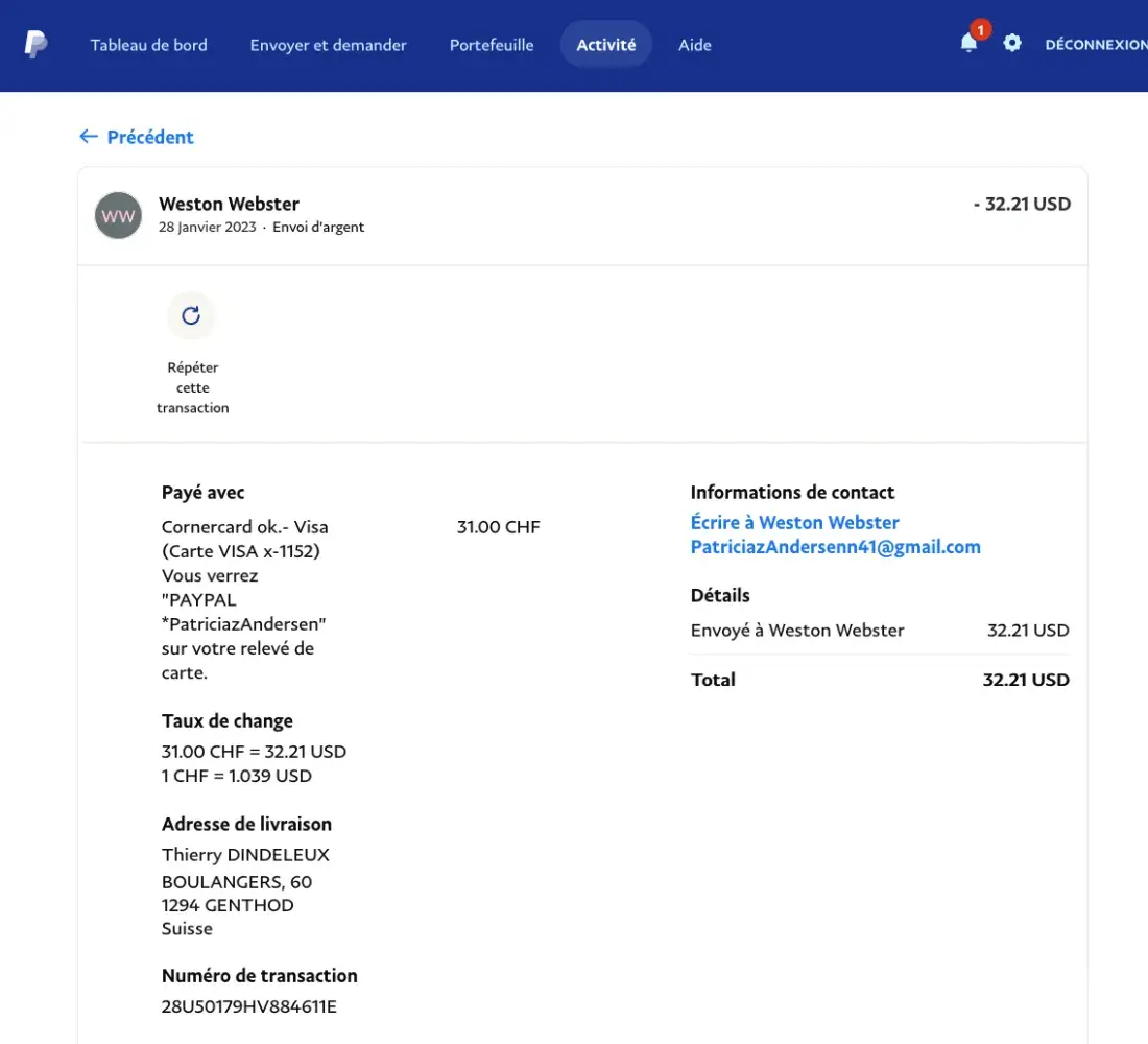 I paid 32.21 usd due to exchange rate conversion chf-usd in favour of the seller payment was sent according to information posted on ioffer for the article funds and received as per paypal confirmation but 4 days after no news at all from the seller in spite of several email-