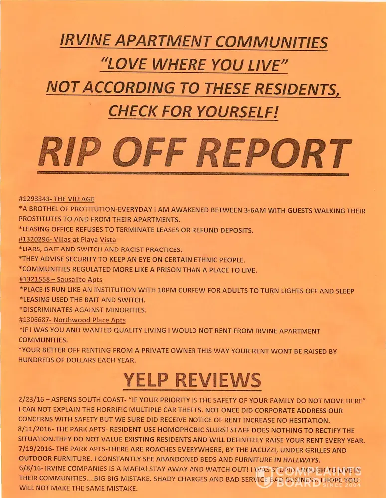 Irvine Company & The Village are continuously in violation of multiple Civil Codes and Ordinances for many years and need to own-up to it, cease engaging in unfair business practices, stop all shoddy business tactics and immediately correct their actions. I'm fine paying the remaining months of my lease while renting elsewhere just to keep my legitimate review and photos on Yelp and continue exposing them to the media! People need to be informed what to expect should they choose to do business with Irvine Company. Again, it's not a financial issue with me; it's principal.