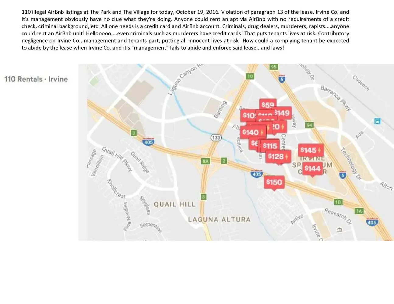Paragraph 13 of the lease specifically states (photo also included with their Yelp profile...approximately page 2 of the photos) it is a violation of the lease for any tenant to "advertise the Premises on AirBnb, Couchsurfing, Craigslist, or any other advertisement or listing service". Furthermore, aside from paragraph 13 of said lease, it is a violation of the Irvine Municipal Code to operate an establishment allowing transient occupancy without obtaining a transient occupancy registration certificate from the City's Manager of Fiscal Services, and without paying the corresponding transient occupancy tax.