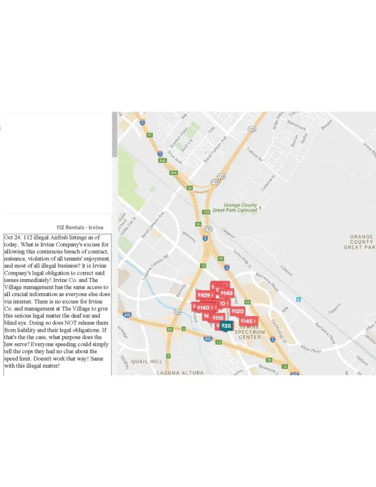 Irvine Company and management are constantly maintaining a nuisance at The Village. They are continuously failing to enforce paragraph 13 of the lease by allowing the illegal AirBnb business to be conducted at the property. They have been informed of this matter numerous times and negligently give it the blind eye and deaf ear. The only thing Irvine Company did was send a sugarcoated generic letter to all tenants at The Village dated June 13, 2016, informing them how it's a violation of the lease to sublease their unit (aka running an AirBnb business).