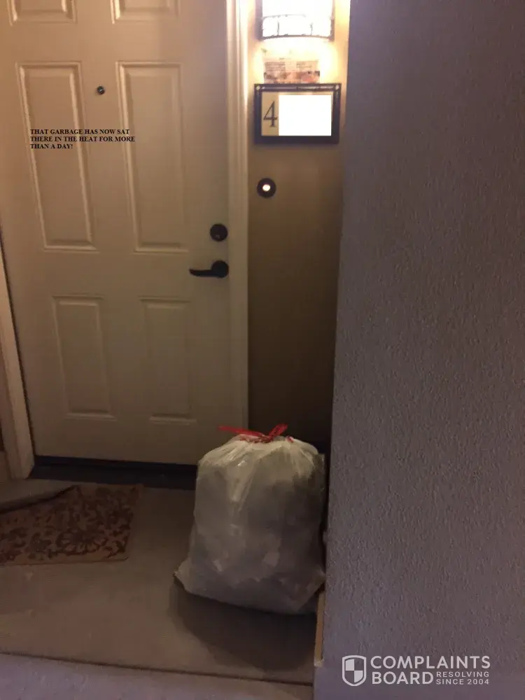 Either way, Irvine Co. and management has a legal obligation to make certain the property/dwelling is kept in every part clean, sanitary and free from all accumulation of debris, filth, rubbish, garbage, rodent and vermin pursuant to Civil Code Section 1941.1(a)(6). What's their reason for allowing trash to sit outside apartments for more than a day and even longer than a week?