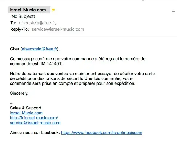 Thanks for the info ! www.israel-music.com is a RIP OFF. I have been wondering what happened to my order of September 4, 2021 - my account at israel-music.com shows "payment received." However, no email confirmation, no response from Israel Music, and no charge has appeared on my card statement in 3 weeks, and I will try to get the company to block Israel Music if they suddenly try to process this payment.