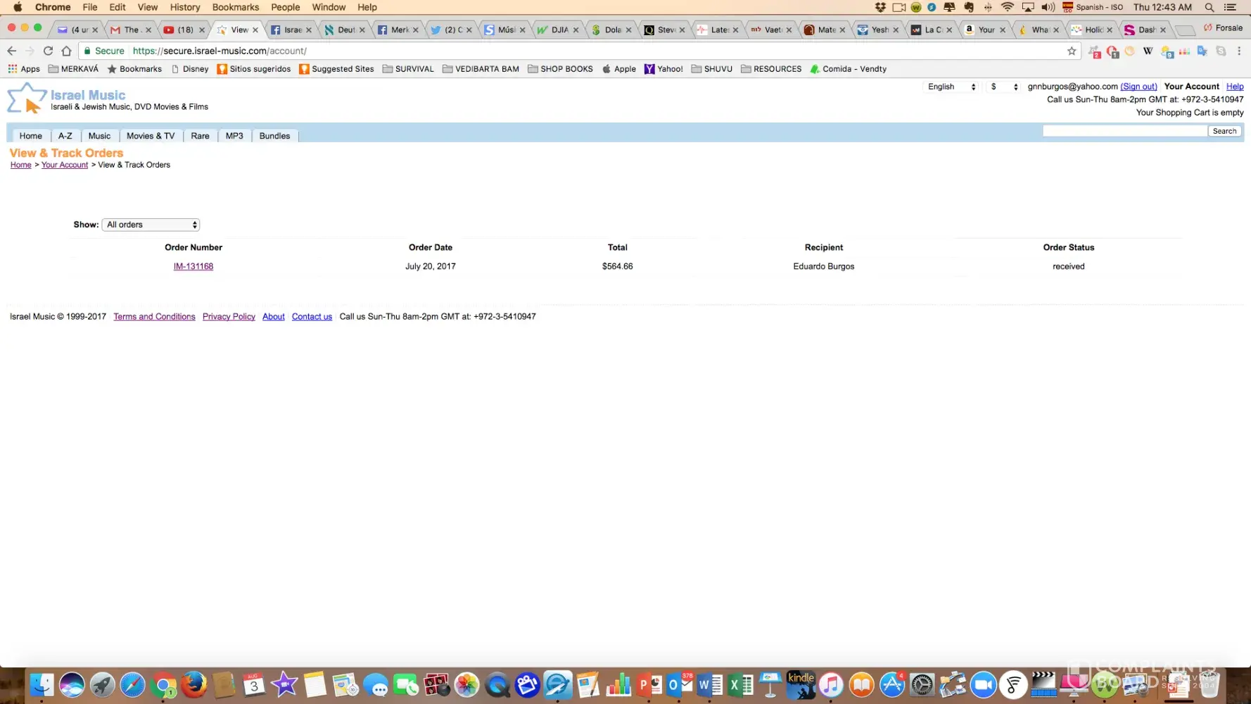 I purchased some CDs in Israel Music back in 2014. I went to the same, and it was very frustrating, I spent USD 200, but the CDs never arrived, sent multiple emails with no response. I was attended by a guy who took note of my order and my name; both times, it was the same person, but it was very difficult to rare that he took the call. On both occasions, he told me in his lousy English that my order was already being processed and shipped. Eventually, I got tired of calling and emailing, the charge went straight to my credit card, and I could never get my money back.