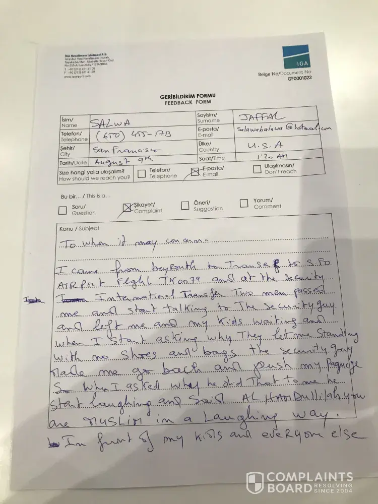 My name is Salwa Jaffal. On Friday, August 9, 2019, I arrived to Istanbul International Airport with my twin girls. When we were going through security at international transfers, a man and his two kids had pushed past us to the front of the line, but I had just ignored them. But what had frustrated me the most was that the security guard who was working at that time was talking to the other people as if they were friends, ignoring me and my kids, and left me on the other side of the metal detector without my bags, carry-ons, shoes, and phones. I tried to ask the guard about my stuff in a loud voice so he could hear me, he began to laugh at me, telling me to come back to the other side to get my belongings myself. When I tried to talk to him, he was teasing me saying that I was a bad Muslim, and the other people who had pushed past us before were saying they were better because they are Christian. So I went up to the information desk, telling them what had happened, they didn't care about what I was saying until I had stated that I was an American citizen, then they gave me more attention because I had threatened to sue the airport. I have a picture of the complaint I wrote at the desk that includes all of my information, so please contact me through email, because I felt, as a Muslim woman, humiliated, in a Muslim country, feeling as if women with the hijab are not valued. For my next trip, I will be using airlines that respect women better than you have, and will be giving you bad reviews.