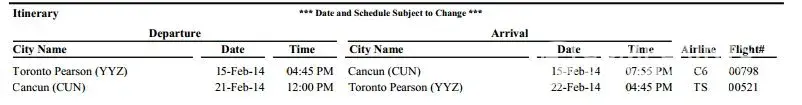 Cancun (CUN) 21-Feb-14 12:00 PM Toronto Pearson (YYZ) 22-Feb-14 04:45 PM TS 00521