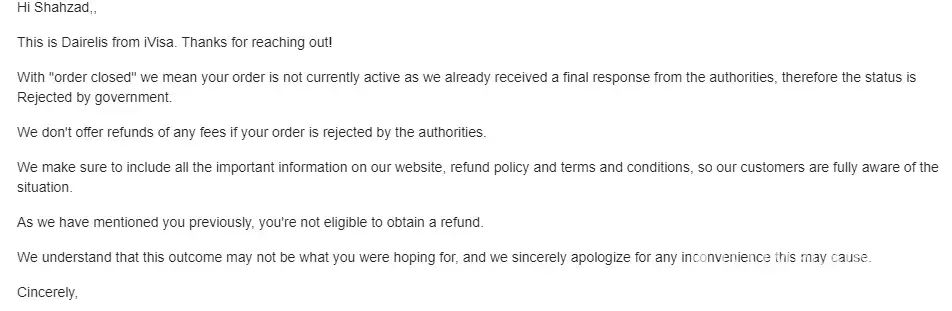 Desired outcome: I want a full refund of iVisa fee I never want anyone else to experience this appalling Company