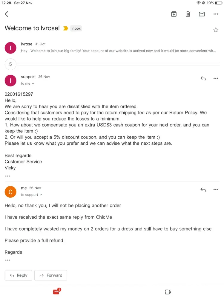 I will never ever use IVRose again and I would not recommend them to anyone. Their customer service is terrible and they don't seem to care about their customers at all. It's a shame because I really liked their clothes, but the terrible service has put me off completely. I hope they improve their service in the future, but until then, I'll be taking my business elsewhere.