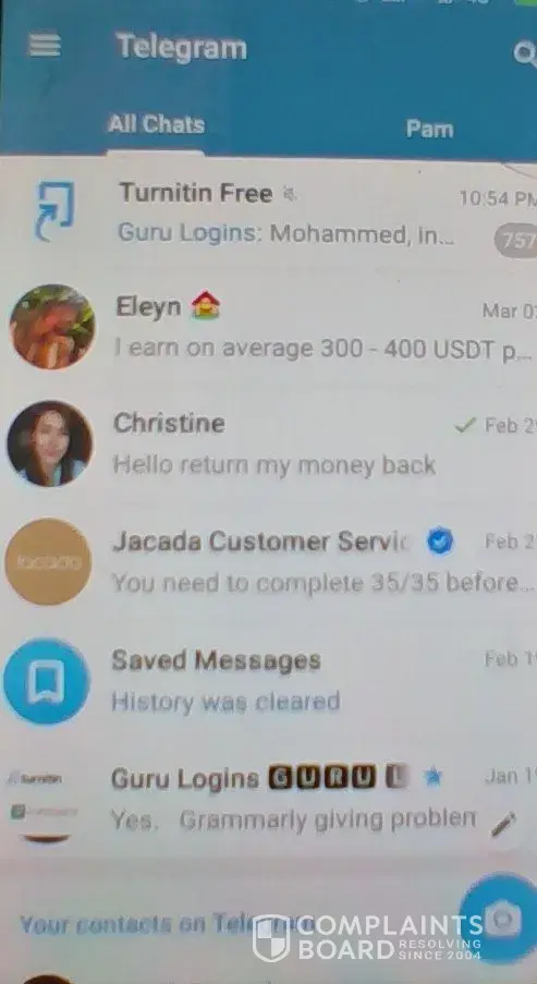 I will request to Alex Malcolm (Merchant) to look into my situation and return my money back. Please stop all these non-sense on Telergam prepaid task. Please return my money back. You people took my 56000USDT in cryptocurrency. Now, please return my money back which you have ask me to deposite at you website (wwwjacadatravelcom). Please donot waste my time to keep you mail so many email to Alex malcolm but he refused to return my money back. This is open organised loot by Alex Malcolm. He should stop this kind of such fraud activity on internet. Such a shame on you Alex Malcolm. I just want to know from Alex malcolm please tell me what was your need to became scammer. It is really required for you to steal money from the people who trust you and your company.