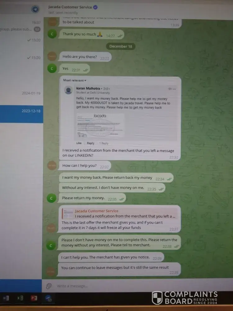 I will request to jacada Travel director Mr. Alex Malcolm (merchant) on Telegram Prepaid task to return my money 40000USDT cryptocurrency which I have submitted at www.Jacadatravel.com website. This jacada travel is just not responding or neither solving this issue by returning my money. Christine from Jacada travel also not responding or returning my money back.