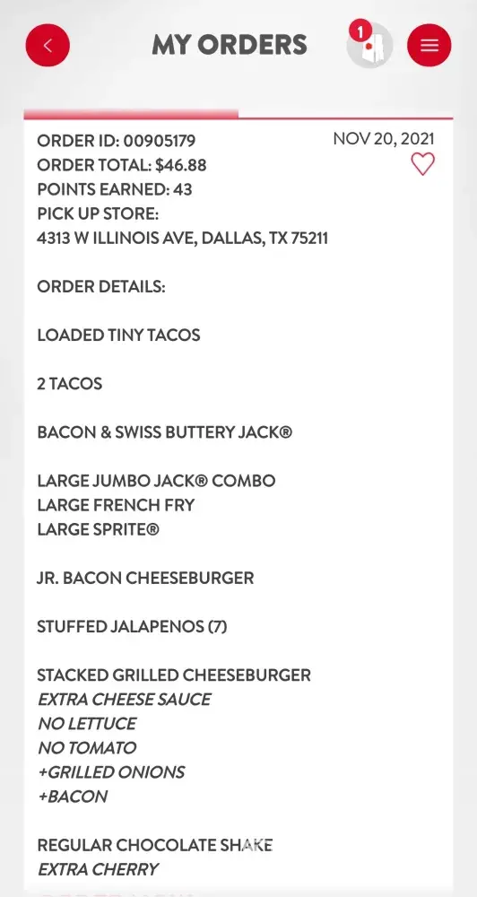 I order jr bacon cheeseburger and dont have bacon ticket#137 jib 4558 date 4/14/2022 time 8:33:07 pm