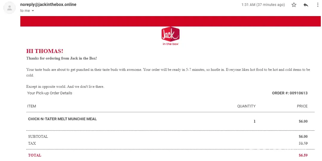 Hello my name is Antonio Ruiz and I've been a customer for Jack in the box for the last 40 years today's September 5th 2021 I ordered a meal to doordash it said my food is ready I'm arriving to check in the box I waited in the Drive-Thru line for another 30 minutes and I got home I'll put my bag my hamburger or sloppy it was a hair in my food it was a disaster like they just made it all fast please I would like for the matter to be taking care of thank you and have a blessed day hope to hear from you guys soon