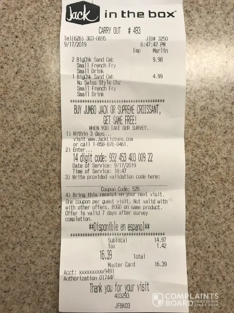 We went to this Jack in the box tonight and asked for $3.99 big chicken sandwich combo. But cashier said they don't sell $3.99, their price is $4.99? I am attached my receipt for you to review. Also the stranger thing is other location they have adds on the window with $3.99 price but this location their add only with pictures but no price on it...