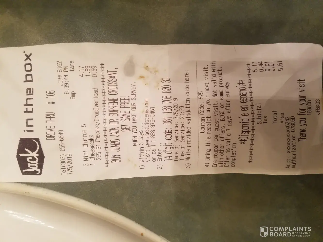 Today, July 18th 2019 is my day of the week that I chose Jack in the Box for lunch as I am a frequent once a week customer. Although I will have to say that I may not be such a frequent customer anymore. I have been paying for extra items, and I say paying as the items are on my receipt but are not on my product. Do the cooks read the ordered menu when it...
