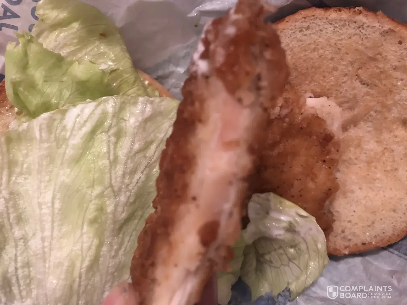 I ordered a order of tacos and 1 chicken sandwich. When I opened my chicken sandwhich it looked weried so I took off the bun and the chicken patty was torn in half and it wasn't even the whole patty it had pink stuff on it in the inner side. This order was at 8:30 at the jack in the box in San Antonio to 78242 Vally hi area. I think it's disgusting and appalling that they would give some one food like this. It wasn't even busy I was the only one In line so there's no excuses. I threw my whole order away due to being worried they did something to my food. plus the young lady never gave me a receipt for my order.