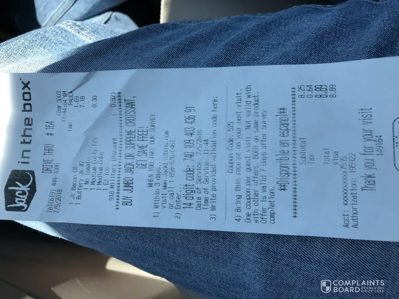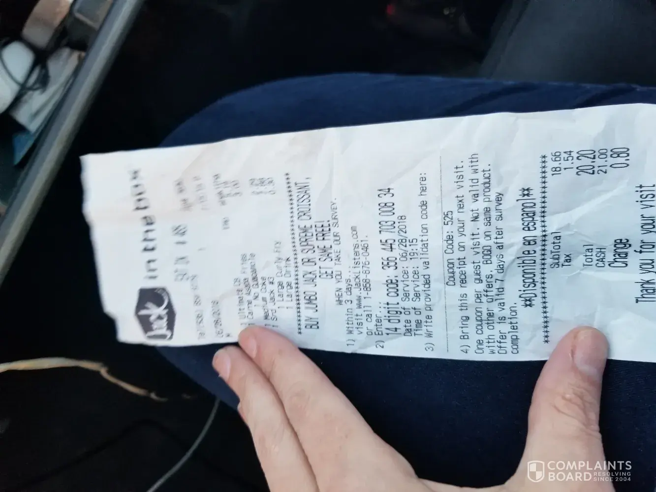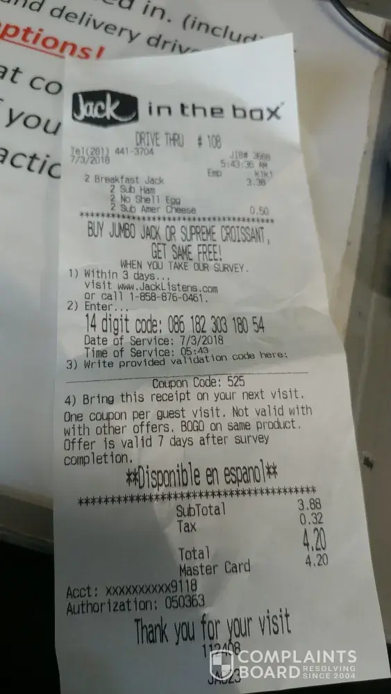 The store in Humble Tx off Mesa ., I wasnt greeted they said can i help u that was strike 1 than i was the 2nd car in line i orderd my food around 5:37a jus 2 breakfast jack with extra meat and cheese, after waiting in line almost10 to 15mins i was highly upset thats strike 2 i had to rush to work almost being late to open in my bag and neither my sandwiches had cheese that strike 3 i called the manger to let her know she rudely ask me what time i came and do i have my receipt i told her its in my car and im at work she pretty much said she couldn't help me and when i find my receipt than call back i will never visit this unprofessional establishment again but i will be taking this food back she made me feel like i was lying and etc i rate they service 0 stars...