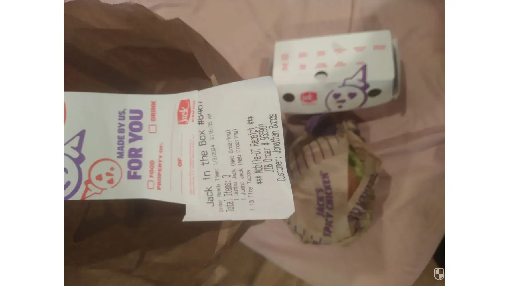 We stopped at Jack in the box and ordered at drive through and got 2 number 10s which is the spicy chicken sandwich meals and 8 tacos when we received and got back on the road we opened bag and the chicken sandwich’s was only bread and chicken no cheese, no lettuce, no tomatoes and we were short 4 tacos
