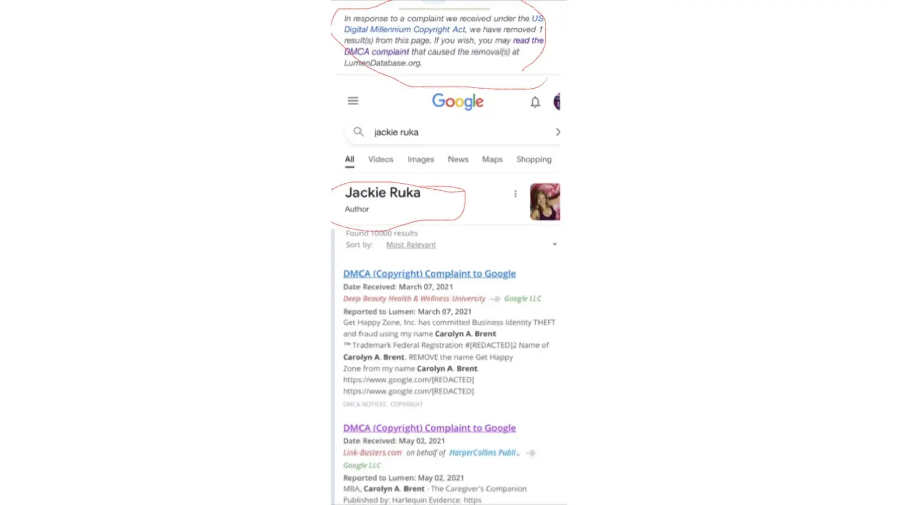 Jackie Ruka has caused undue stress and financial losses to Carolyn A. Brent by malicious and fraudulent means. She continually uses Ms. Brent personal/business information and platforms without permission for her own gain. Doing so is causing Ms. Brent problems with the IRS and state agencies. Ms. Ruka needs to be stopped immediately and made to pay for the damage she has done/doing to Ms. Brent.