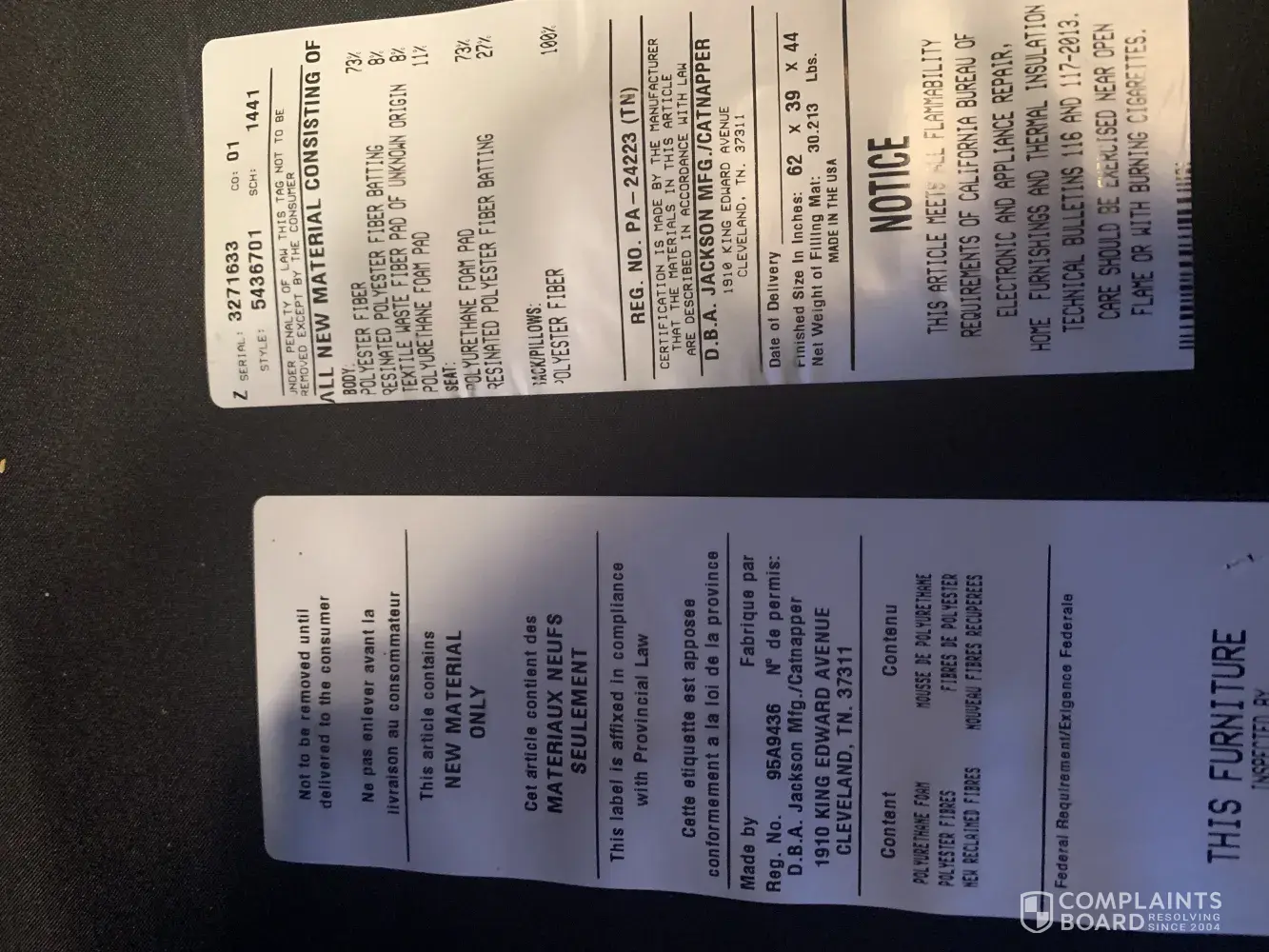 I purchased a couch and love seat manufactured Jackson Furniture / Cat napper from Conn's HomePlus in Raleigh, NC for almost $2000. The problem with the furniture is that it has a strong, very foul odor. I can taste it in the air, I smell it, it bothers my sinuses, sometimes makes my eyes water and gives me a sore throat. It was a replacement for another...