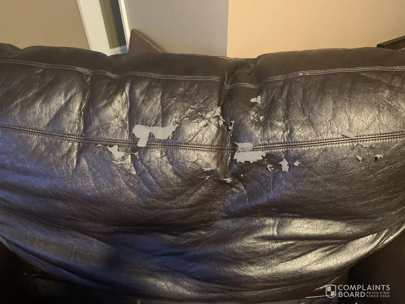 The peeling is down to the fabric in a couple places. The stitching is also coming out in a couple places! Very Very poor quality! We have a very nice house & this ruins the looks of our entire room - EXTREMELY DISAPPOINTED!