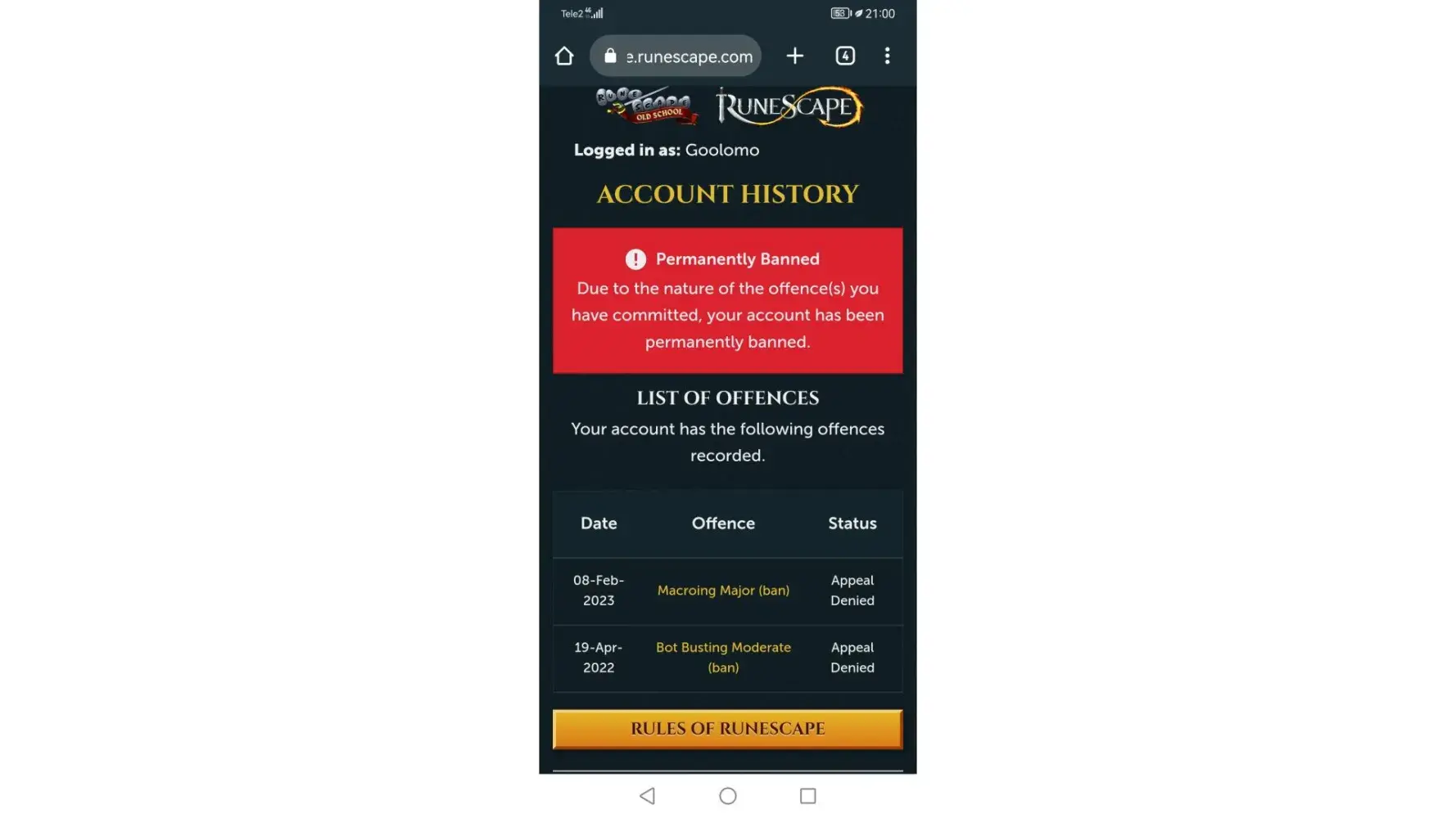Old school runescape / false perma macro major ban