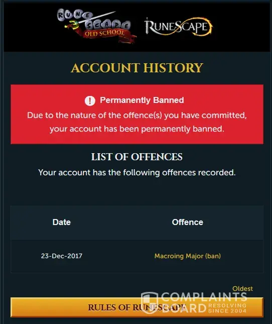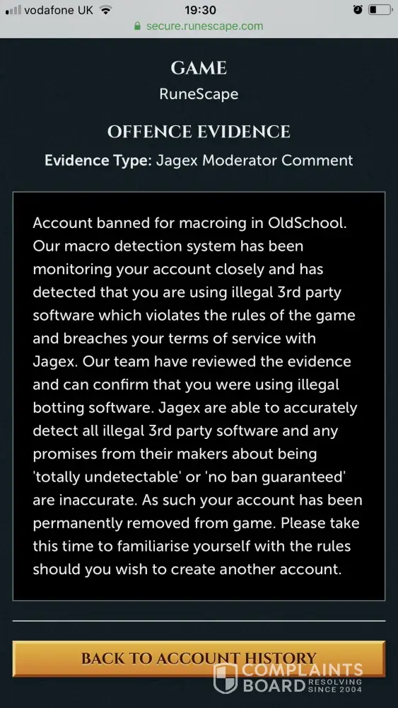Got banned for macroing (using third-party software) even though I have never used any such software. They reviewed my ban and decided to not overturn it. The appeal process did not allow me to argue my case, so I could not provide any evidence. Furthermore, Jagex did not provide me with any evidence that I broke their rules. As a paying player, I am disappointed that I have no rights to my account and I will not be able to use my 15 year old ever again. Furthermore, there is no contact details to formally submit a complaint.