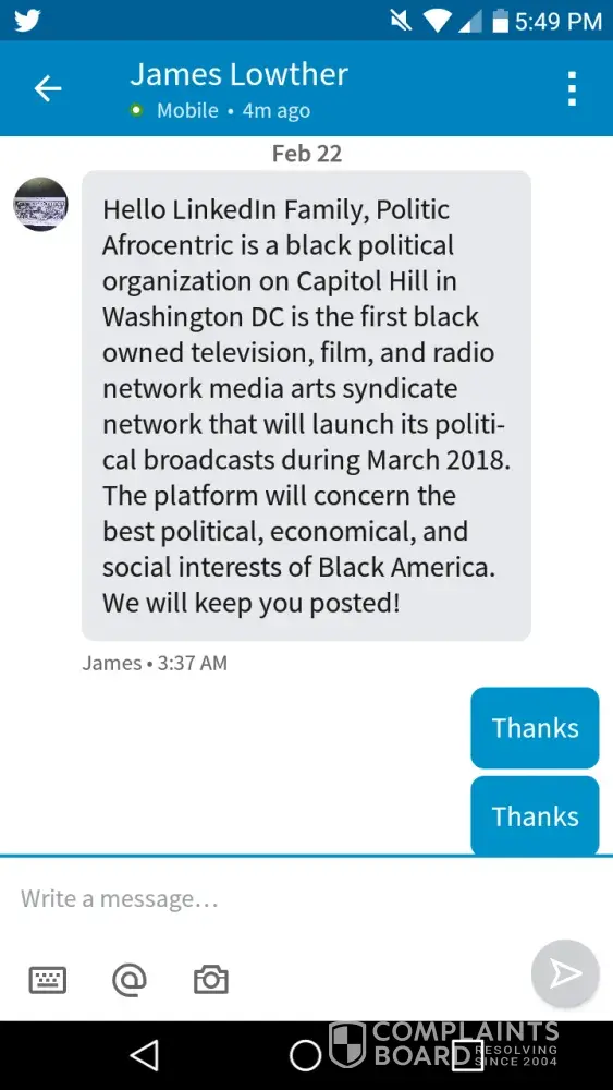 This person contacted me Yesterday asking me to call him at [protected]. He did not answer and he immediately call back from a [protected] advising he needs Film producers and reached out to me regarding a up and coming TV network he has in LA. He says he also have a small one studio opening in DC. Its based on all black political issues and he is working on a film entitled "The Black Yankee" have never heard anything about this person before and his name on Linkedin is James Lowther. He was requesting that I come out to LA and he wants me to come work on his TV and film network as a producer.. He kept telling me he wanted me to fly out to LA so he can introduce me to some powerful film people. He says he is connected to Byron Allen the comedian who just purchased the weather channel.. He also advised he is working to have Tonetalks and Yvette Carnell on his network show.. After contacting some of my friends in the entertainment industry I was advised it's a scam.