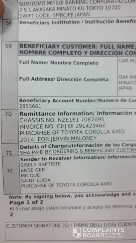 I made a CIF payment to japan partner for a vehicle to be shipped to my home country back on September 2013. Before I made the payment, they promised to deliver the vehicle in less than five weeks. But once I made the payment, I waited for months but they did not deliver the vehicle. No one contacted me to explain what was going on and when I tried to follow the matter I was told that I was being nuisance. I begged them to at least refund me the money but they declined.