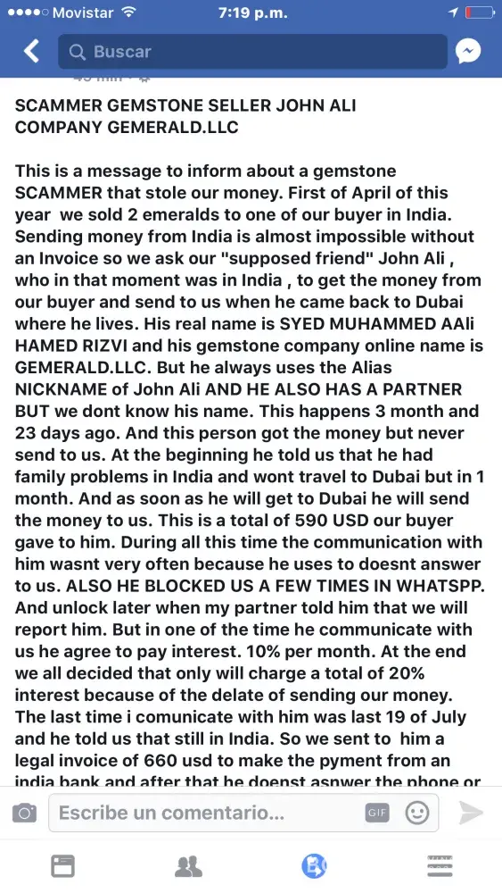 I am Javier Talavera. Last week we reported an scammer on scamologist and blacklist of scammers in gem industry. After we report him on jun 22 he create this story with a fake account with my name on it to create a supposed conversation between me and buyer. I ask to the team of complaintsboard.com to delete this post. No solid evidences, no receipt show of wester union. This is totaly fake.