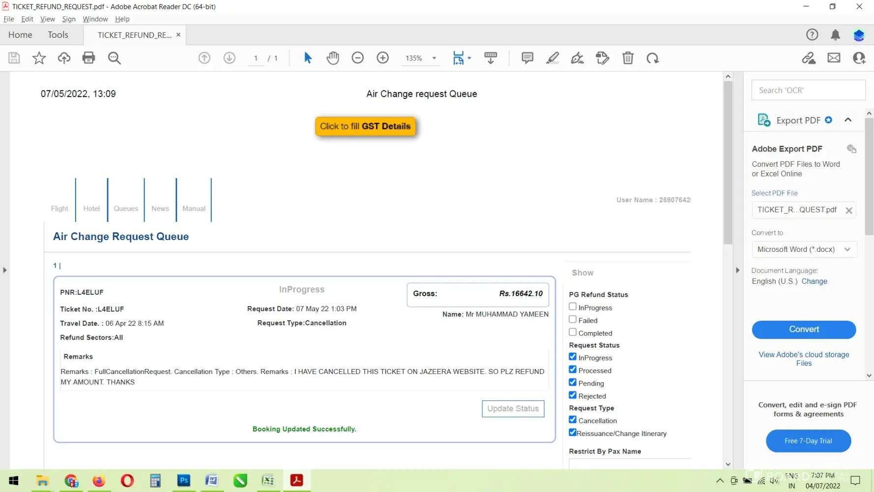 I have cancelled a air ticket with pnr # l4eluf. But no refund initiated against cancellation. Pex name muhammad yameen. Please refund my amount in initial source. My refund amount approx. Inr14000.00. Thanks a lot