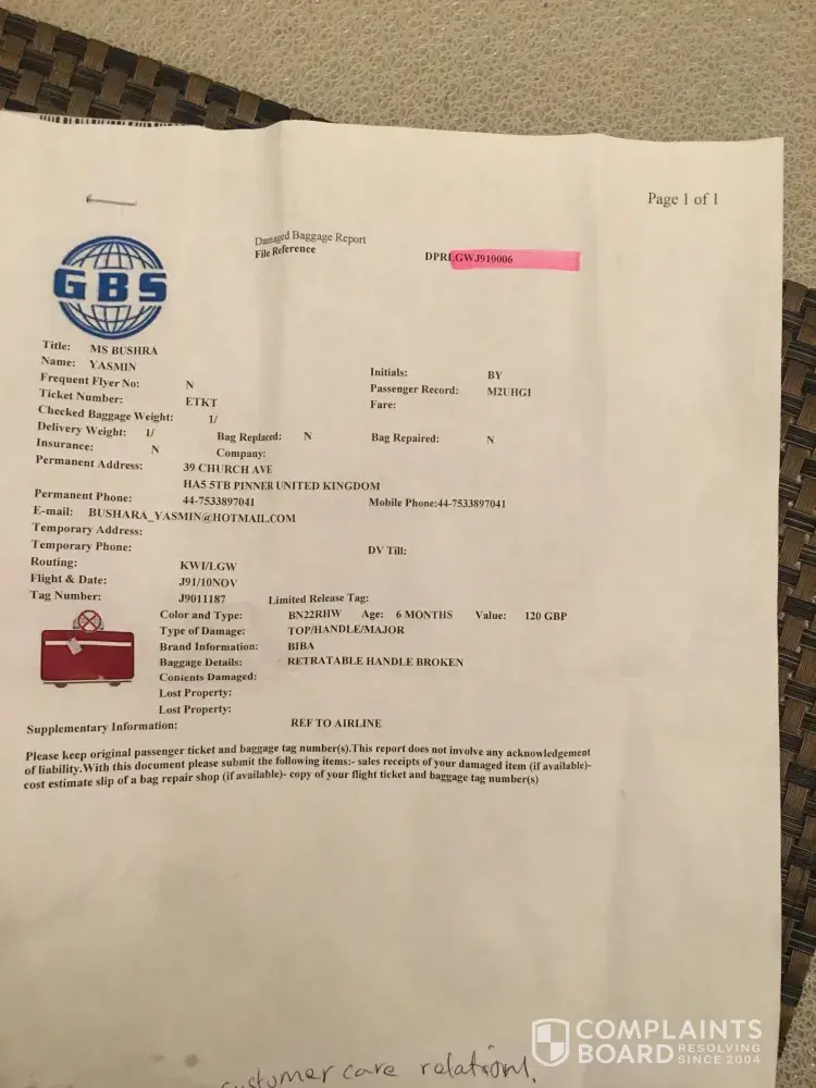 I reported it at the airport and they prepared the damage baggage report and they asked me to provide the ref number online on jazeera airways but I am unable to find online customer relations care where I need to provide the number, therefore I am submitting my complaint and attached the report.