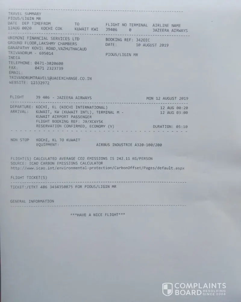 Please be informed that I had a reservation in Jazeera Airways for travelling from Cochin to Kuwait on Aug. 10, 2019. It was rescheduled for Aug. 12, 2019. Due to flood and bad weather conditions, I don't think I can reach to Nedumbasseri from Kollam, Kerala for the fly and I decided take an early flight from Trivandrum, Kerala. Since my visa is going to expire I don't want to take risks by choosing again Nedumabasseri for my travel. So booked another flight from Trivandum, Kerala. Attached my ticket copy for your reference. My ticket was booked through a travel agent (Unimoni Financial Services Ltd.). I send email to Jazeera to explain the situation and they told me my ticket will cancel, they are gonna process refund. After few weeks I got a confirmation that the refund has been done from Jazeera's side and get in touch with Travel Agent ((Unimoni Financial Services Ltd.). Until now (03/09/2019), after successful completion of 24 days I haven't received a single penny either from Travel Agent or from the airline.