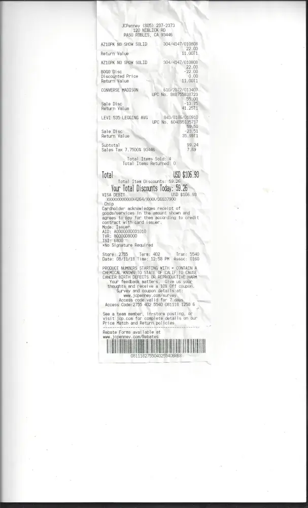 I traveled out of town for a weekend in Paso Robles, CA (August 11) and visited a JC Penney store. I bought a few items including a pair of tennis shoes and Levi's. I planned on wearing the tennis shoes that night and found a security tag. I had enough time to take them to the store with my receipt and the tag was removed. I live 21/2 hours away and a few days later took out my Levi's. There is another security tag! I have no plans on visiting Paso Robles again so I called customer service and was told "there is nothing they can do". I can't wear the pants with a security tag and JC Penney should know the store's security system clearly does not work and I am out $$ and unhappy.