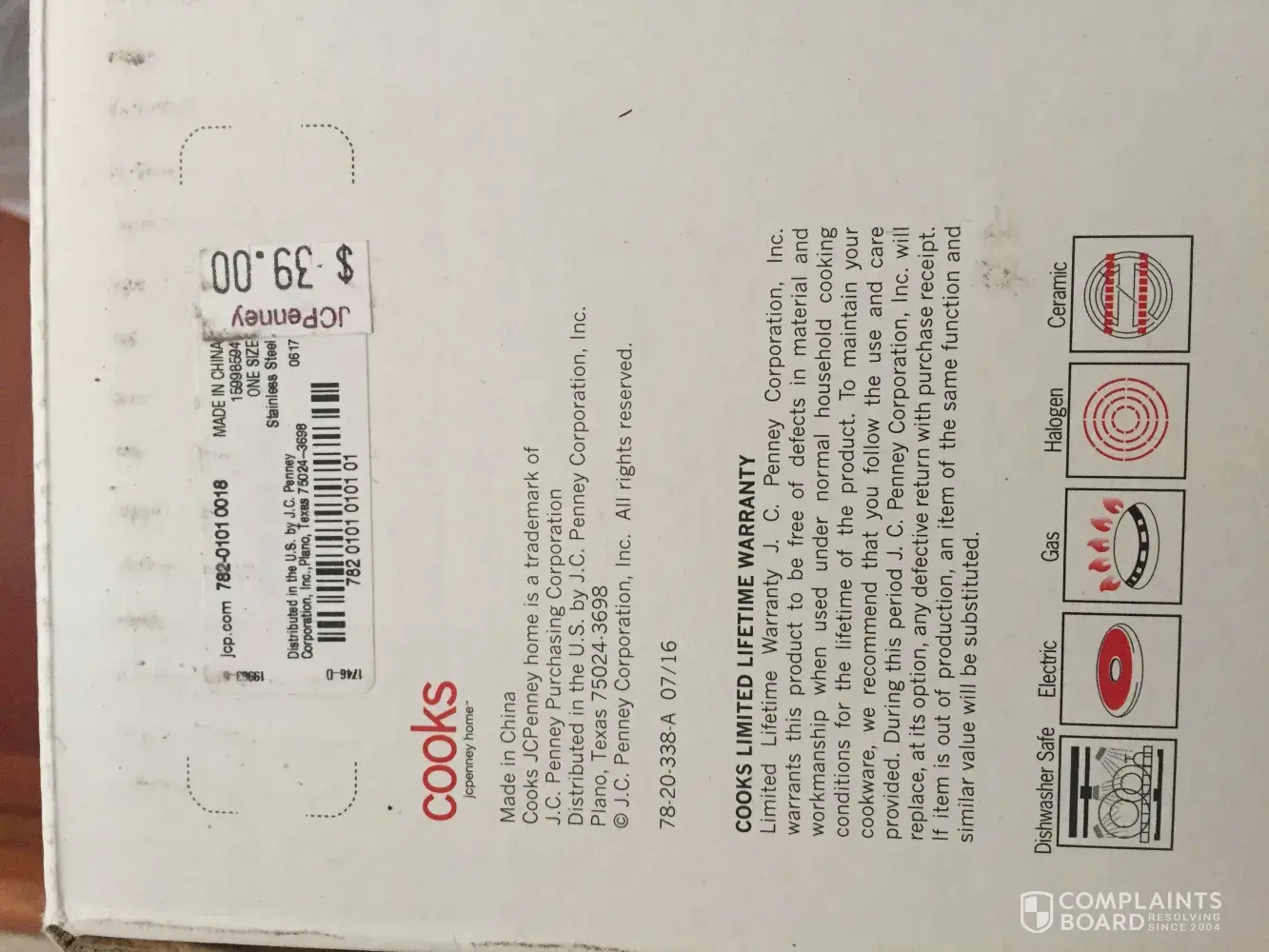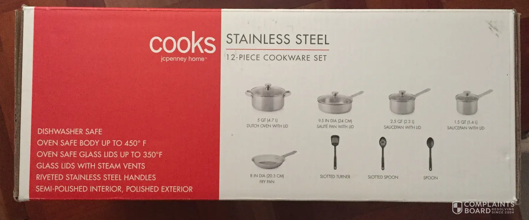 The 1/7/2018 at miday I bought at the Manhattan Mall a 12 pice cookware stainless set Cooks JC Penny Home.