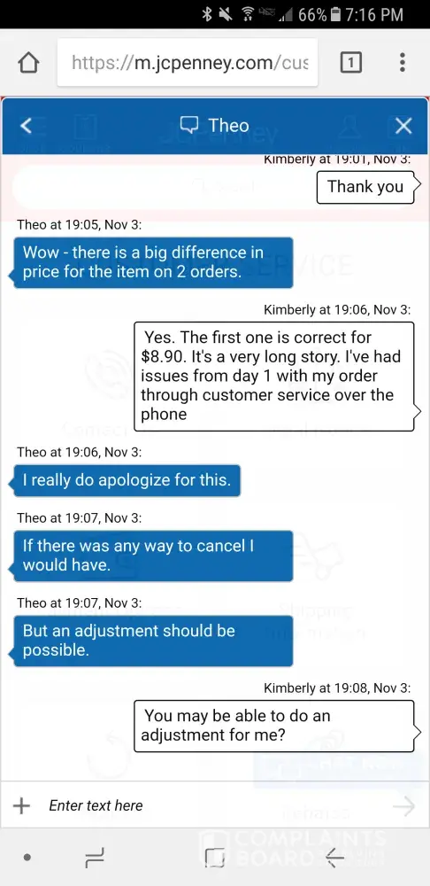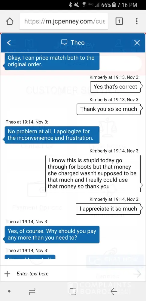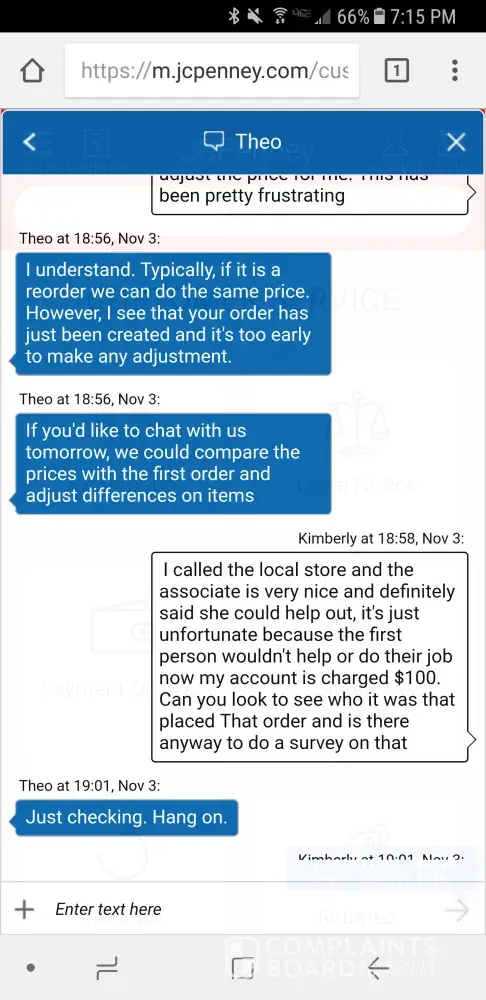 I talked to a gal last night and was re ordering a pair or boots I ordered that didn't fit. After asking for the last 4 of my card on the back, she then told me she could not adjust the price for the boots I originally paid even though it was a reorder. I told her not to place the order and received an email stating she placed it. My account was withdrawn $100 from it when I originally paid less than $10 for the boots. I called customer service 10 min after and they said they couldn't cancel the order. I then spoke to Theo on JC Penny chat and he said he could adjust the price last night. I called customer service this morning and they said he hadn't adjusted it nor could they. I'm pretty upset with customer service over the phone and how I've been treated. My local store is always very nice and helpful but not customer service when I call in. I will not be recommending JC Penny or shopping anymore there.