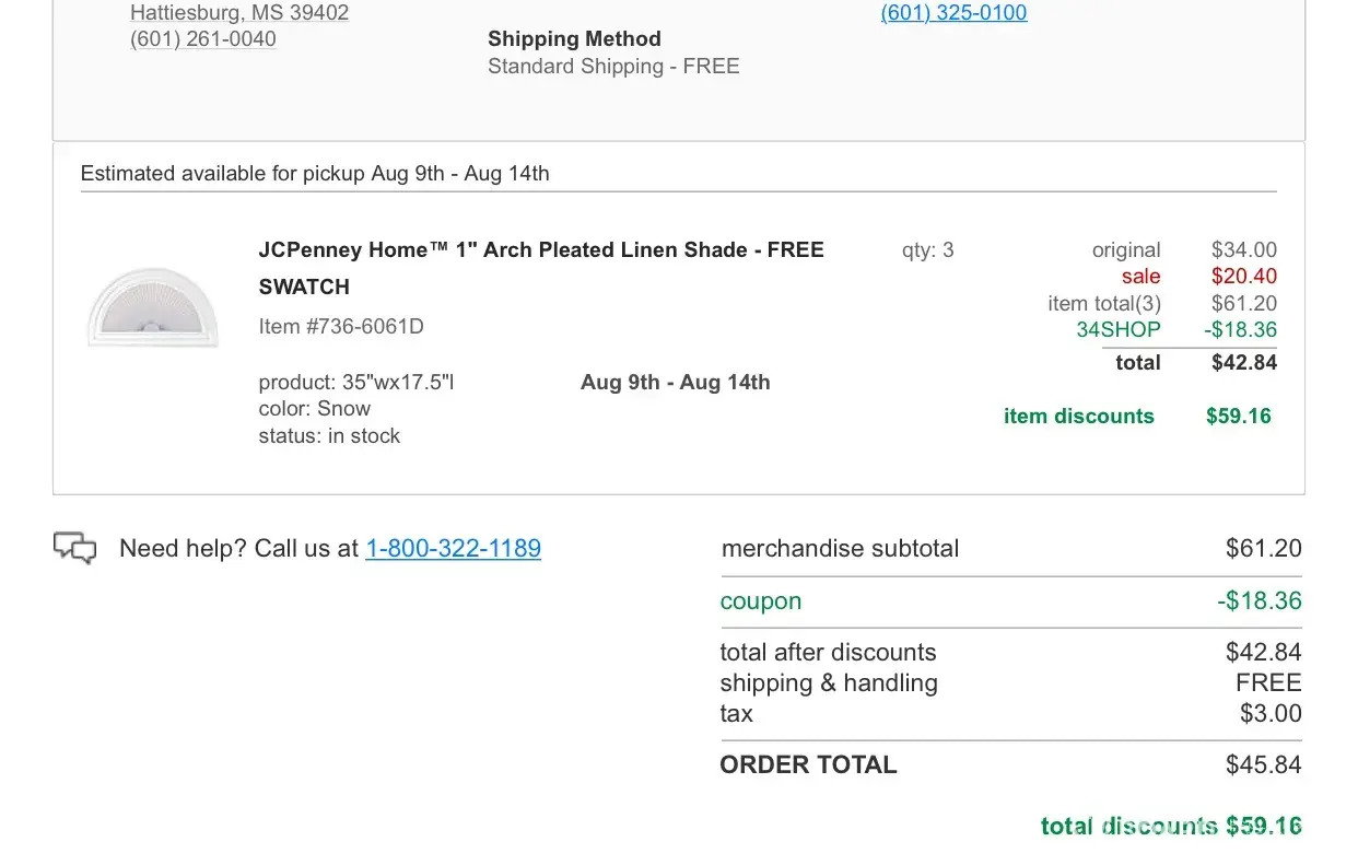 I would not recommend ordering anything from Jc Penny's website. I placed an order on August 3, 2017. The order was to be shipped to the store between Aug 9-14th. I made a call on the August 15, 2017 to find out they had no idea why item couldn't be shipped and the best they could do would refund my money after I was on hold for over 20 mins waiting for that response, no discounts, no apology, just "Oh we don't know why the item didn't ship." This was my first time placing an online order through JC Penny.com and it will be my last!