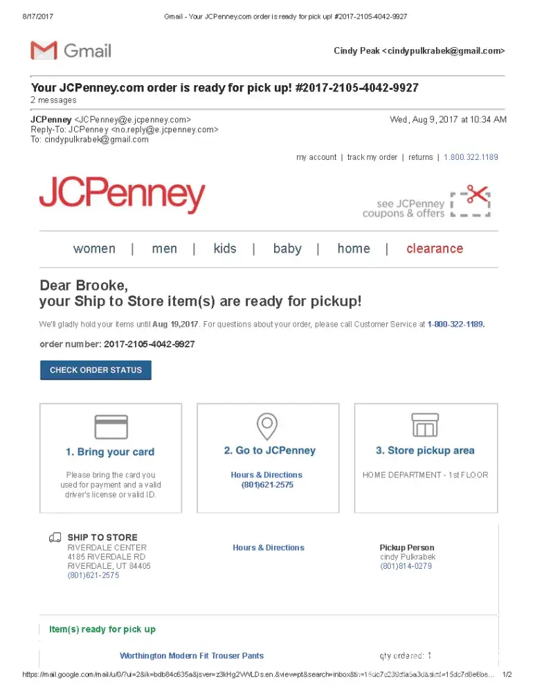I received an email and phone call from JCP indicating my order was ready for pick up on August 9, 2017. I went to the Riverdale, UT store on August 15, 2017 to pick up my order. First the employee told me they didn't have my order, when I showed her the email I received she went back to the storage area and after 35 minutes she came back to tell me they didn't have my order. She then does some more research and tells me that there was a shortage on the items I ordered and that my ordered was cancelled and my credit card had been reimbursed for the charges. I logged into my bank to find out my card has not (and still has not) been reimbursed.