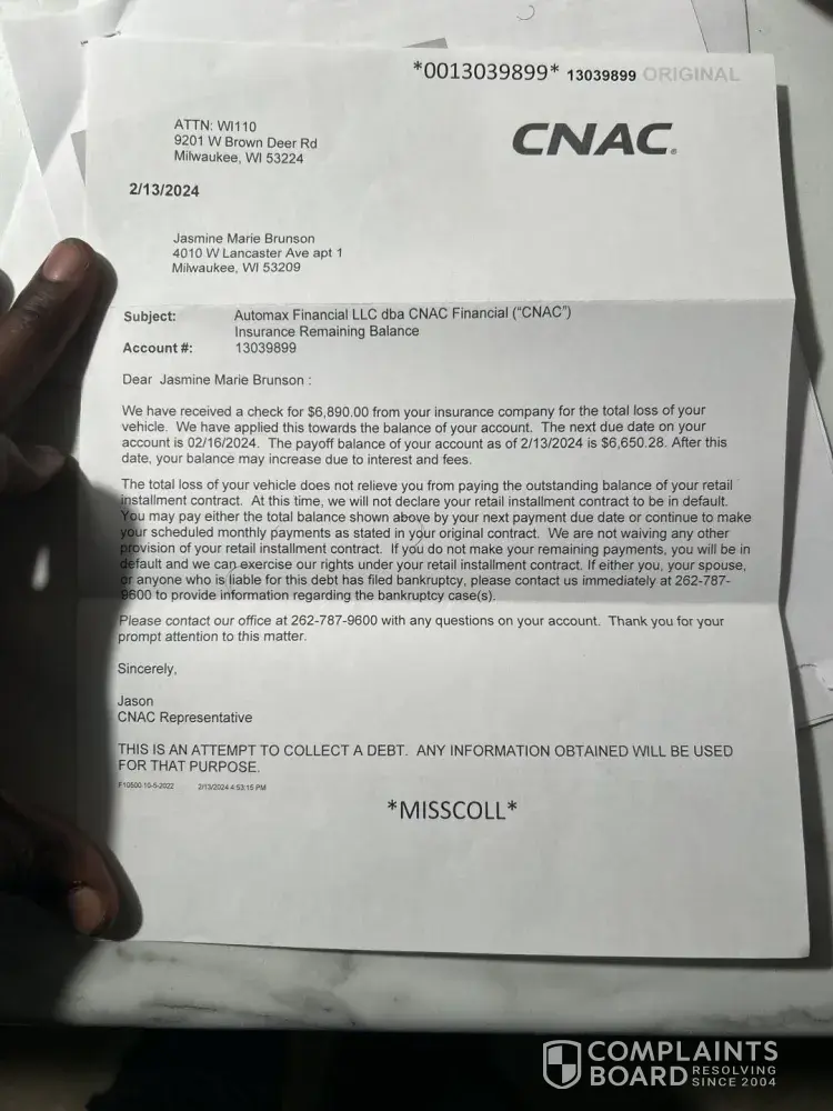 CNAC sent me a transaction history and my balance was different when I paid payments. When I made a payment the loan balance never changed. I have receipts, and I also have transaction history from my bank. INVESTIGATION ON THIS COMPANY NEEDS TO TAKE EFFECT IMMEDIATELY!