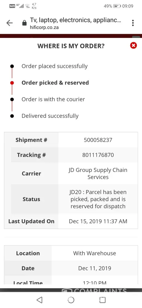 You have a tracking system to track online orders, it however does not reflect what is happening, my order was being prepare, the next minute I get a call to say my goods are at my gate, no call to confirm if I will be there? Just open we want to deliver? My mail indicates the delivery date, I also sent a number of follow up mails to ensure that my goods is not transported Unnecessarily and it being damaged.