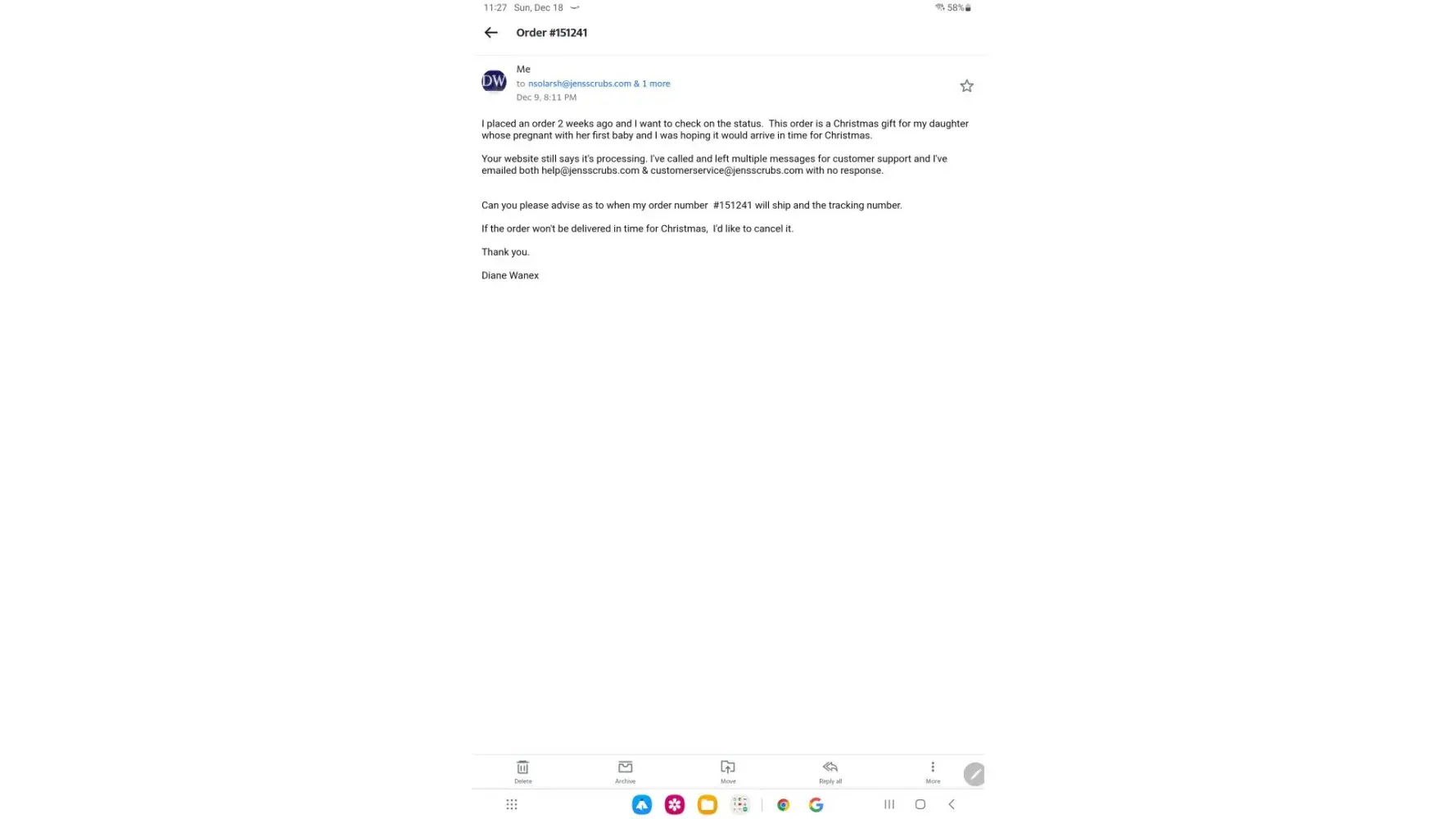 Since that time I have sent multiple emails to the company about the missing items from the order, I even ask to just be refunded if they haven't received the Jockey scrubs yet. I have received no response to any of the emails.
