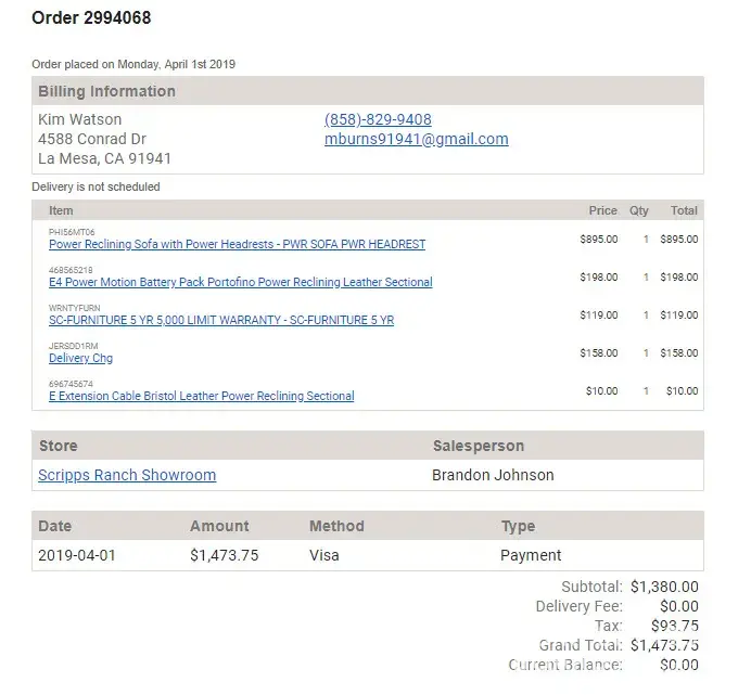 On 4/1, we purchased (what we believed to be) a reclining piece for our TV room. Our order number was 2994068. When it arrived, it was an incorrect piece. It was a sofa, when we had actually wanted a loveseat. We contacted the store, and a new order was created 2995768. The invoices are for $1473.75 (old) and $1405.62 (new). I have since learned that...