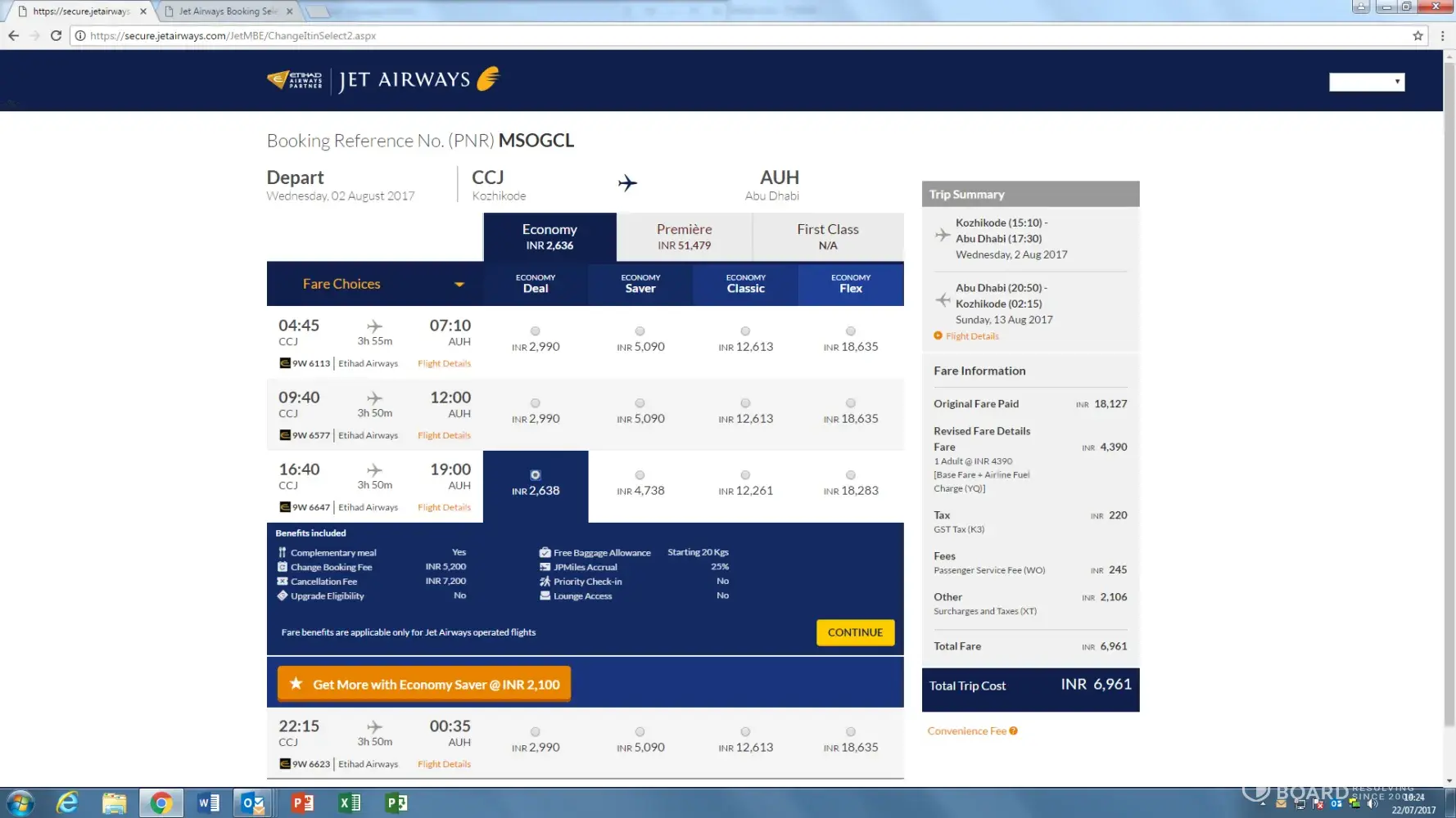 I tried to change the above booking from 31-July to 02-August (CCJ/AUH), on 22-July at 10:30 hours, but to my surprise, there is a additional charge of INR 6, 961 (whereas the fare on checking the site is the same as the previous day). Since there was no change in the published fare for this sector, and there was a 'zero' fee for change announced by Jet Airways, I did not accept the additional fee and did not change the booking - this caused me considerable inconvenience and disruption in travel plans.