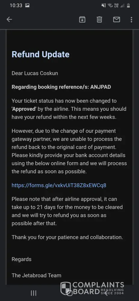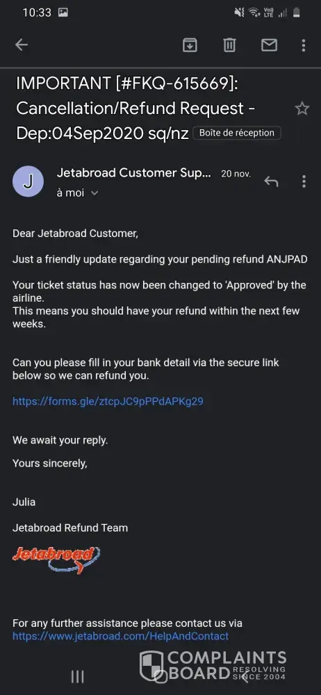 Since emailing Jetabroad about this multiple times over the last two months, they have stopped responding, having previously done so. This can only suggest that they have stolen my refund from the airline.