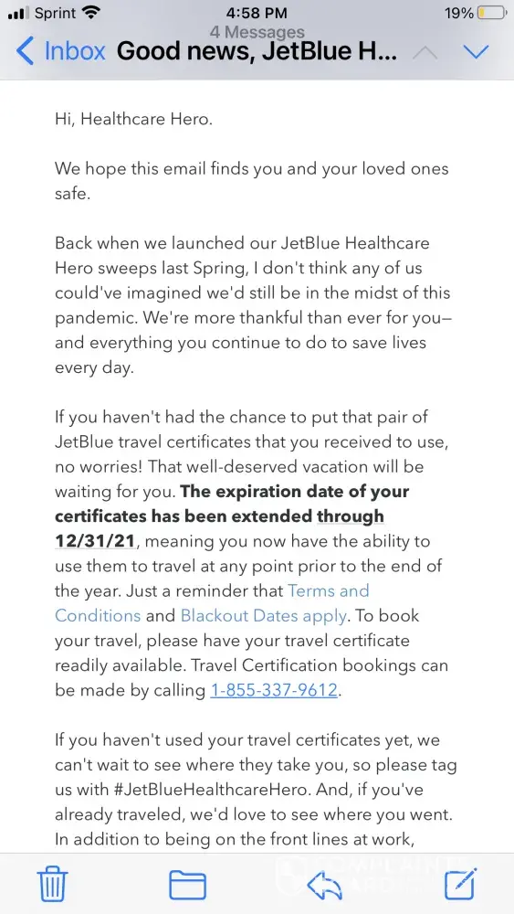 I received an email from Jet Blue that I received a "PAIR of CERTIFICATES" as a Health Care hero's nomination. The email uses the plural of the word certificate"s" and the Word "PAIR". I was finally able to get approved time of from work which cannot be given back only to be told when I tried to book our flights that Jet Blue made and error and that my nomination was different than other health care workers and I should have been told it was one ticket even though I received a second email from them stating my PAIR of tickets has now been extended to be used until December 2021 due to Covid. I was told it was a "typo" from Jet Blue and that I need to purchase my second ticket and they refuse to honor what they have told me for a whole year that I received. Spoke with two very snarky customer services representatives who gave me an oh well attitude even after acknowledging their own error. They love the media response they received for this campaign but refuse to honor what they offered to me even after acknowledging their error