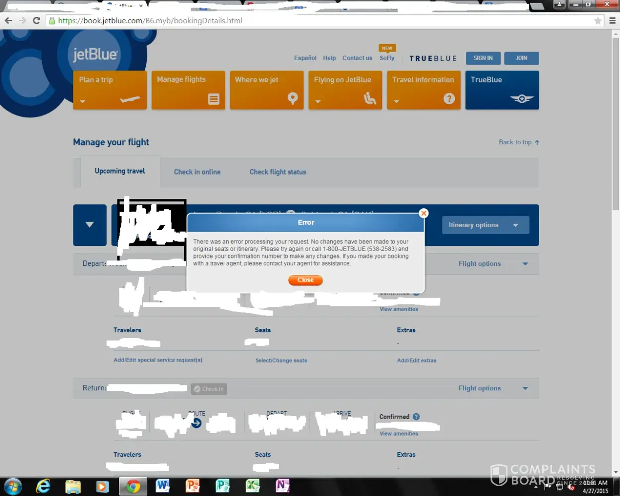 For months now, I've had a problem with booking reservations on JetBlue's web site. I get through the process, select everything, submit the payment request, and the system hangs. My technical environment is standard. Win7 pro, IE8, all software current.
