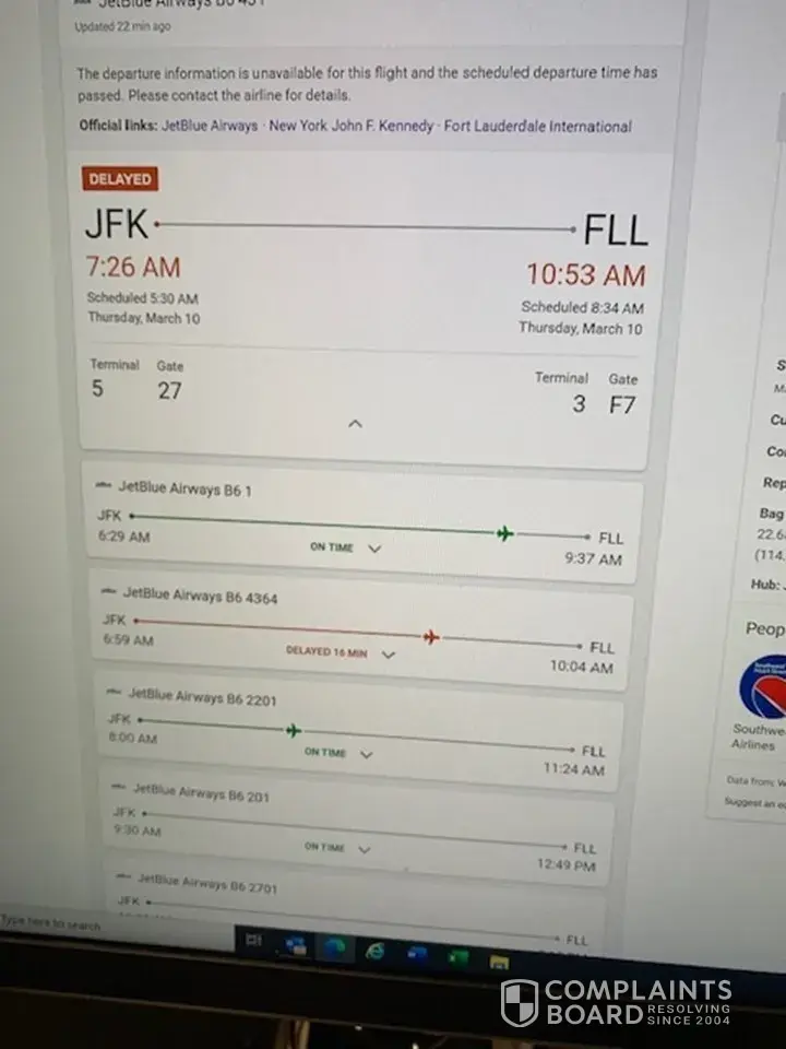 Issue: Return Flight RSW to JFK ...Flt#B6930 Departing 12:37pm