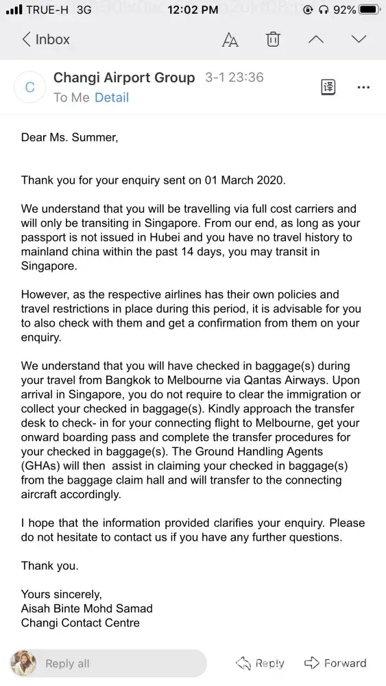 First, according to Singapore Changi Airport latest policy, I am still qualified to transit. I have no idea on what basis did Qantas make that decision. I asked for explanation, and the staff told me they did not know. They only knew the decision as it is.